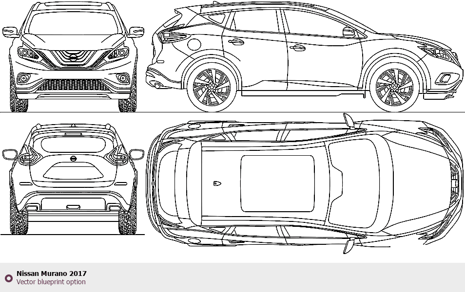 Raster blueprint of the 2017 Nissan Murano SUV. This free downloadable image can be used for graphic projects, digital design, and 3D modeling. The file provides accurate exterior proportions of the vehicle. Model year: 2017. Body type: SUV.