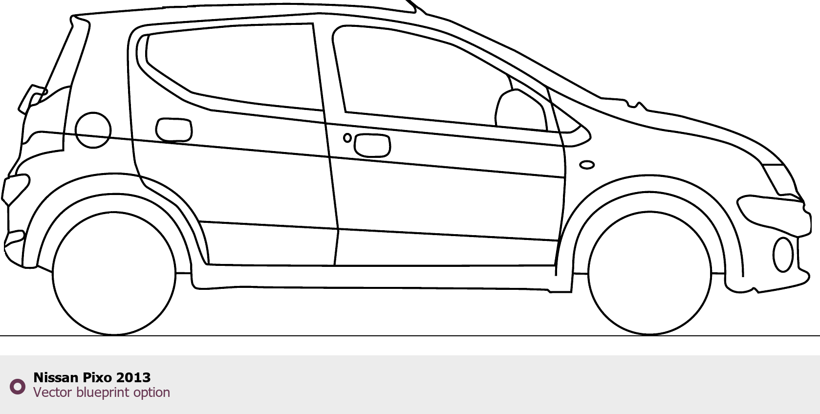 Raster blueprint of the 2013 Nissan Pixo Hatchback. This free downloadable image can be used for graphic projects, digital design, and 3D modeling. The file provides accurate exterior proportions of the vehicle. Model year: 2013. Body type: Hatchback.