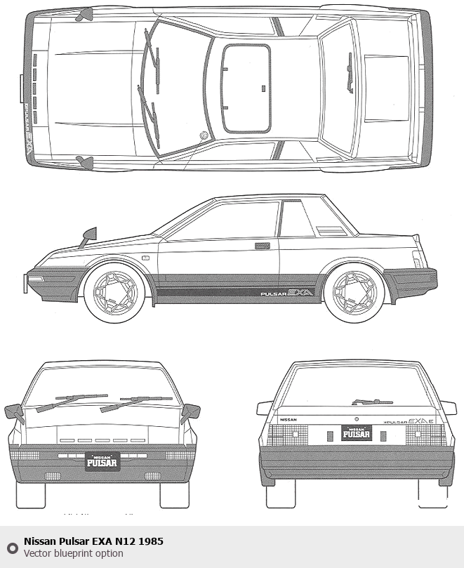 Raster blueprint of the 1985 Nissan Pulsar EXA N12 Tag. This free downloadable image can be used for graphic projects, digital design, and 3D modeling. The file provides accurate exterior proportions of the vehicle. Model year: 1985. Body type: Tag.