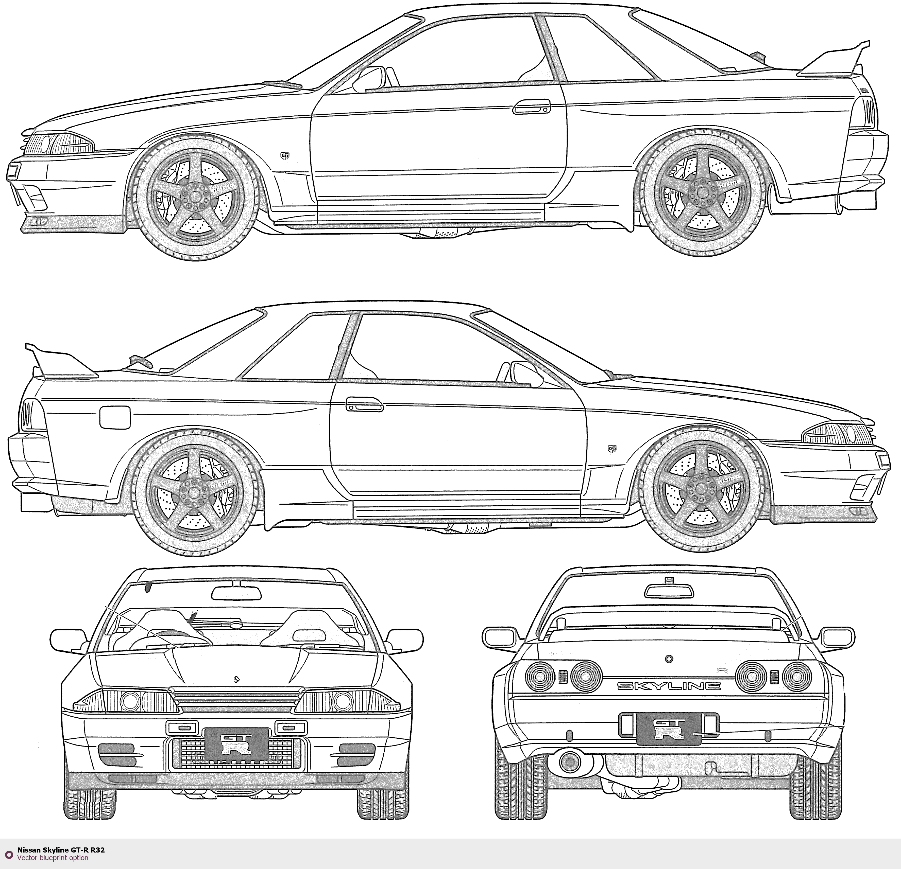 Raster blueprint of the Nissan Skyline GT-R R32 Coupe. This free downloadable image can be used for graphic projects, digital design, and 3D modeling. The file provides accurate exterior proportions of the vehicle. Body type: Coupe.