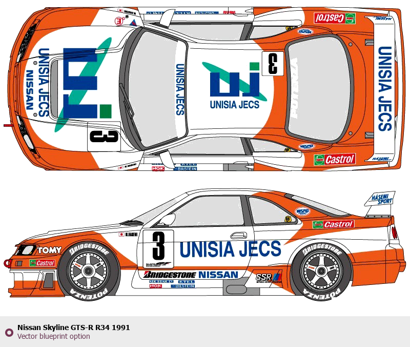 Raster blueprint of the 1991 Nissan Skyline GTS-R R34 Tag. This free downloadable image can be used for graphic projects, digital design, and 3D modeling. The file provides accurate exterior proportions of the vehicle. Model year: 1991. Body type: Tag.