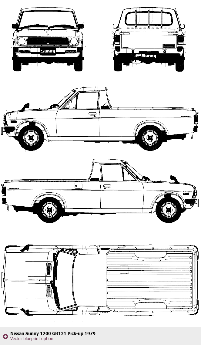 Raster blueprint of the 1979 Nissan Sunny 1200 GB121 Pick-up Pickup Truck. This free downloadable image can be used for graphic projects, digital design, and 3D modeling. The file provides accurate exterior proportions of the vehicle. Model year: 1979. Body type: Pickup Truck.