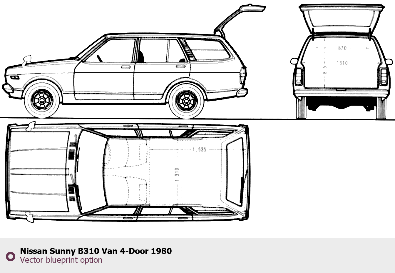 Raster blueprint of the 1980 Nissan Sunny B310 Van 4-Door Van. This free downloadable image can be used for graphic projects, digital design, and 3D modeling. The file provides accurate exterior proportions of the vehicle. Model year: 1980. Body type: Van.