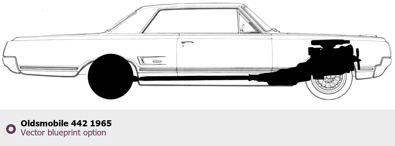 Raster blueprint of the 1965 Oldsmobile 442 Tag. This free downloadable image can be used for graphic projects, digital design, and 3D modeling. The file provides accurate exterior proportions of the vehicle. Model year: 1965. Body type: Tag.