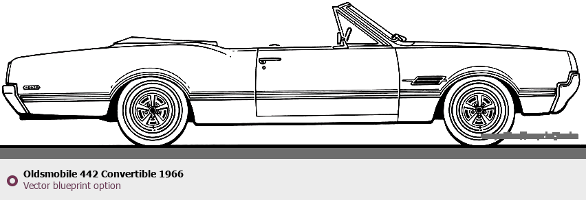 Raster blueprint of the 1966 Oldsmobile 442 Convertible Cabriolet. This free downloadable image can be used for graphic projects, digital design, and 3D modeling. The file provides accurate exterior proportions of the vehicle. Model year: 1966. Body type: Cabriolet.