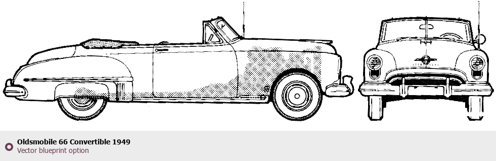 Raster blueprint of the 1949 Oldsmobile 66 Convertible Cabriolet. This free downloadable image can be used for graphic projects, digital design, and 3D modeling. The file provides accurate exterior proportions of the vehicle. Model year: 1949. Body type: Cabriolet.