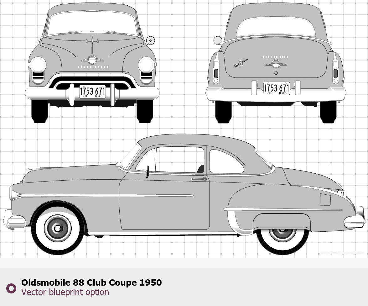 Raster blueprint of the 1950 Oldsmobile 88 Club Coupe Coupe. This free downloadable image can be used for graphic projects, digital design, and 3D modeling. The file provides accurate exterior proportions of the vehicle. Model year: 1950. Body type: Coupe.