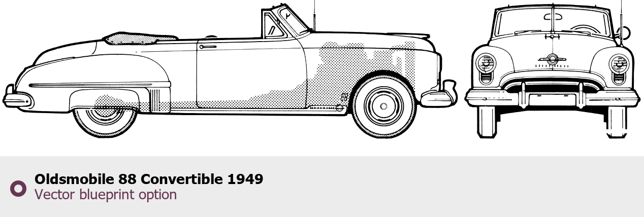 Raster blueprint of the 1949 Oldsmobile 88 Convertible Cabriolet. This free downloadable image can be used for graphic projects, digital design, and 3D modeling. The file provides accurate exterior proportions of the vehicle. Model year: 1949. Body type: Cabriolet.
