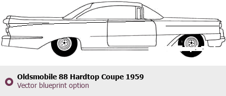 Raster blueprint of the 1959 Oldsmobile 88 Hardtop Coupe Coupe. This free downloadable image can be used for graphic projects, digital design, and 3D modeling. The file provides accurate exterior proportions of the vehicle. Model year: 1959. Body type: Coupe.