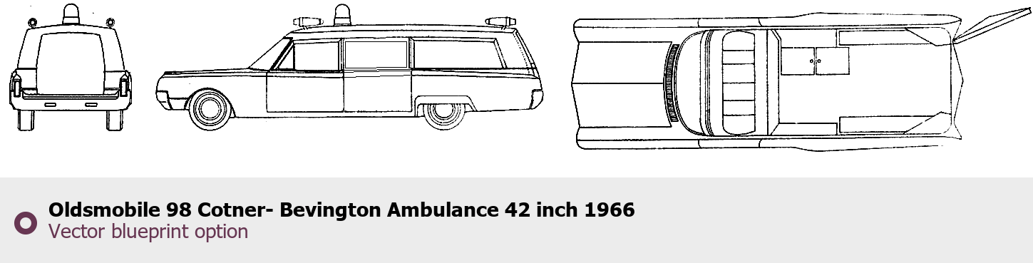 Raster blueprint of the 1966 Oldsmobile 98 Cotner- Bevington Ambulance 42 inch Tag. This free downloadable image can be used for graphic projects, digital design, and 3D modeling. The file provides accurate exterior proportions of the vehicle. Model year: 1966. Body type: Tag.