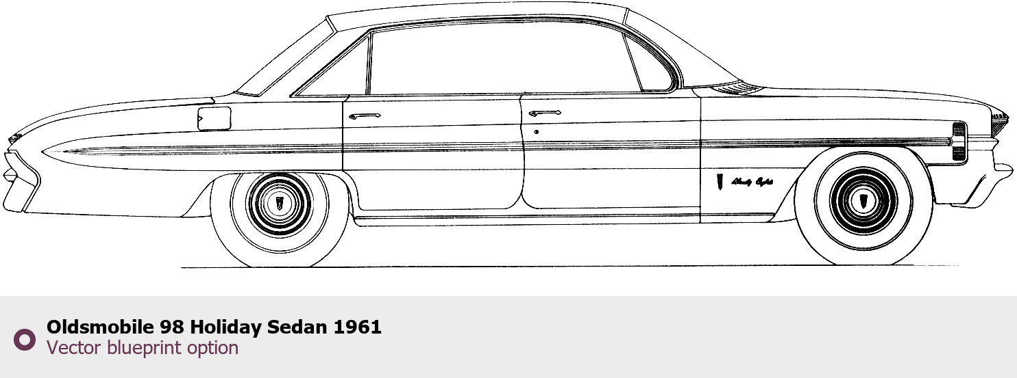 Raster blueprint of the 1961 Oldsmobile 98 Holiday Sedan Sedan. This free downloadable image can be used for graphic projects, digital design, and 3D modeling. The file provides accurate exterior proportions of the vehicle. Model year: 1961. Body type: Sedan.