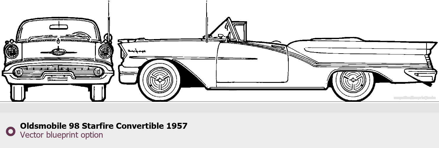 Raster blueprint of the 1957 Oldsmobile 98 Starfire Convertible Cabriolet. This free downloadable image can be used for graphic projects, digital design, and 3D modeling. The file provides accurate exterior proportions of the vehicle. Model year: 1957. Body type: Cabriolet.