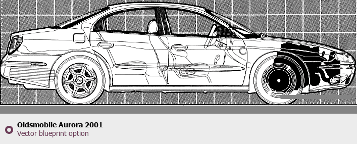 Raster blueprint of the 2001 Oldsmobile Aurora Sedan. This free downloadable image can be used for graphic projects, digital design, and 3D modeling. The file provides accurate exterior proportions of the vehicle. Model year: 2001. Body type: Sedan.