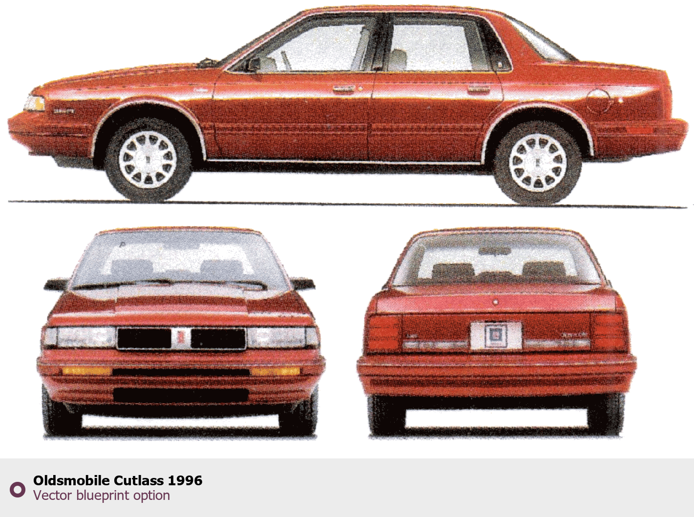 Raster blueprint of the 1996 Oldsmobile Cutlass Tag. This free downloadable image can be used for graphic projects, digital design, and 3D modeling. The file provides accurate exterior proportions of the vehicle. Model year: 1996. Body type: Tag.