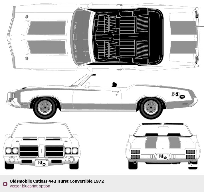Raster blueprint of the 1972 Oldsmobile Cutlass 442 Hurst Convertible Cabriolet. This free downloadable image can be used for graphic projects, digital design, and 3D modeling. The file provides accurate exterior proportions of the vehicle. Model year: 1972. Body type: Cabriolet.