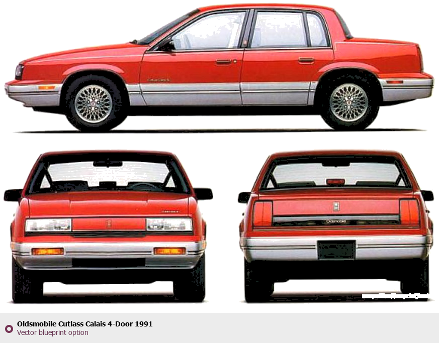 Raster blueprint of the 1991 Oldsmobile Cutlass Calais 4-Door Tag. This free downloadable image can be used for graphic projects, digital design, and 3D modeling. The file provides accurate exterior proportions of the vehicle. Model year: 1991. Body type: Tag.