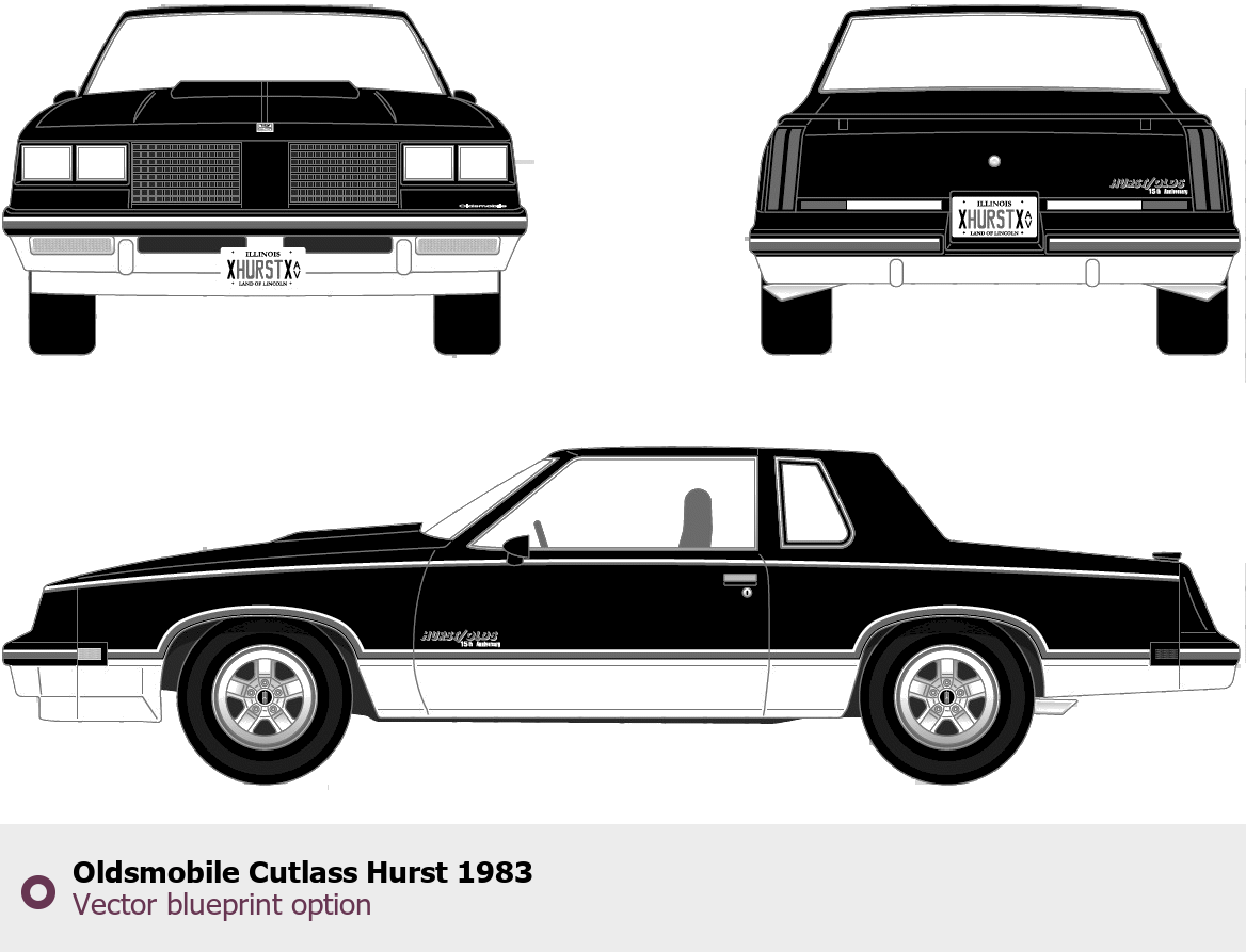 Raster blueprint of the 1983 Oldsmobile Cutlass Hurst Tag. This free downloadable image can be used for graphic projects, digital design, and 3D modeling. The file provides accurate exterior proportions of the vehicle. Model year: 1983. Body type: Tag.
