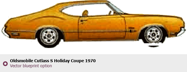 Raster blueprint of the 1970 Oldsmobile Cutlass S Holiday Coupe Coupe. This free downloadable image can be used for graphic projects, digital design, and 3D modeling. The file provides accurate exterior proportions of the vehicle. Model year: 1970. Body type: Coupe.