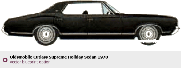 Raster blueprint of the 1970 Oldsmobile Cutlass Supreme Holiday Sedan Sedan. This free downloadable image can be used for graphic projects, digital design, and 3D modeling. The file provides accurate exterior proportions of the vehicle. Model year: 1970. Body type: Sedan.