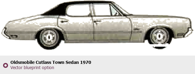 Raster blueprint of the 1970 Oldsmobile Cutlass Town Sedan Sedan. This free downloadable image can be used for graphic projects, digital design, and 3D modeling. The file provides accurate exterior proportions of the vehicle. Model year: 1970. Body type: Sedan.