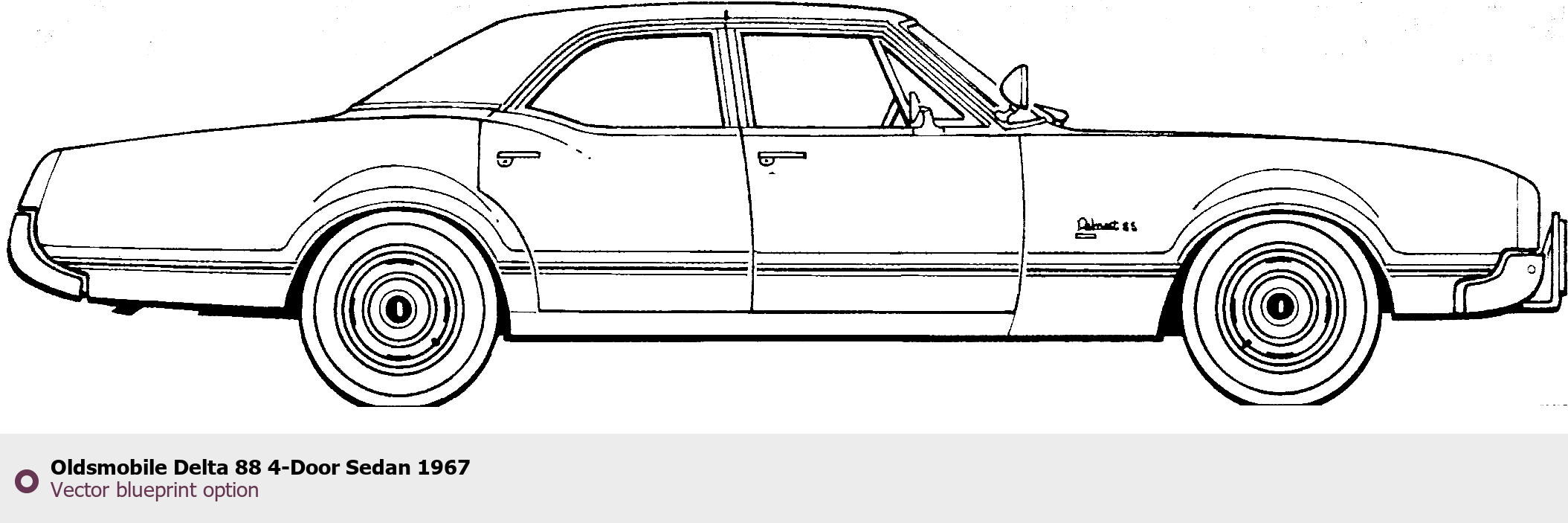 Raster blueprint of the 1967 Oldsmobile Delta 88 4-Door Sedan Sedan. This free downloadable image can be used for graphic projects, digital design, and 3D modeling. The file provides accurate exterior proportions of the vehicle. Model year: 1967. Body type: Sedan.