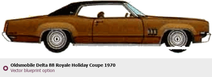 Raster blueprint of the 1970 Oldsmobile Delta 88 Royale Holiday Coupe Coupe. This free downloadable image can be used for graphic projects, digital design, and 3D modeling. The file provides accurate exterior proportions of the vehicle. Model year: 1970. Body type: Coupe.