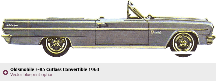 Raster blueprint of the 1963 Oldsmobile F-85 Cutlass Convertible Cabriolet. This free downloadable image can be used for graphic projects, digital design, and 3D modeling. The file provides accurate exterior proportions of the vehicle. Model year: 1963. Body type: Cabriolet.