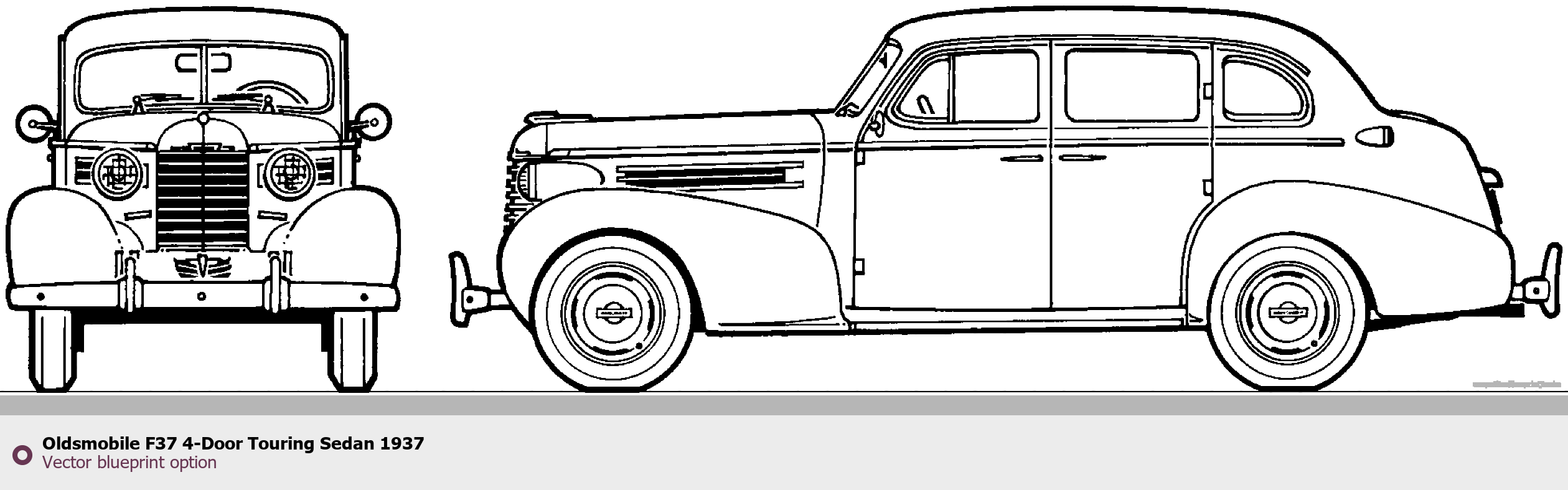 Raster blueprint of the 1937 Oldsmobile F37 4-Door Touring Sedan Sedan. This free downloadable image can be used for graphic projects, digital design, and 3D modeling. The file provides accurate exterior proportions of the vehicle. Model year: 1937. Body type: Sedan.