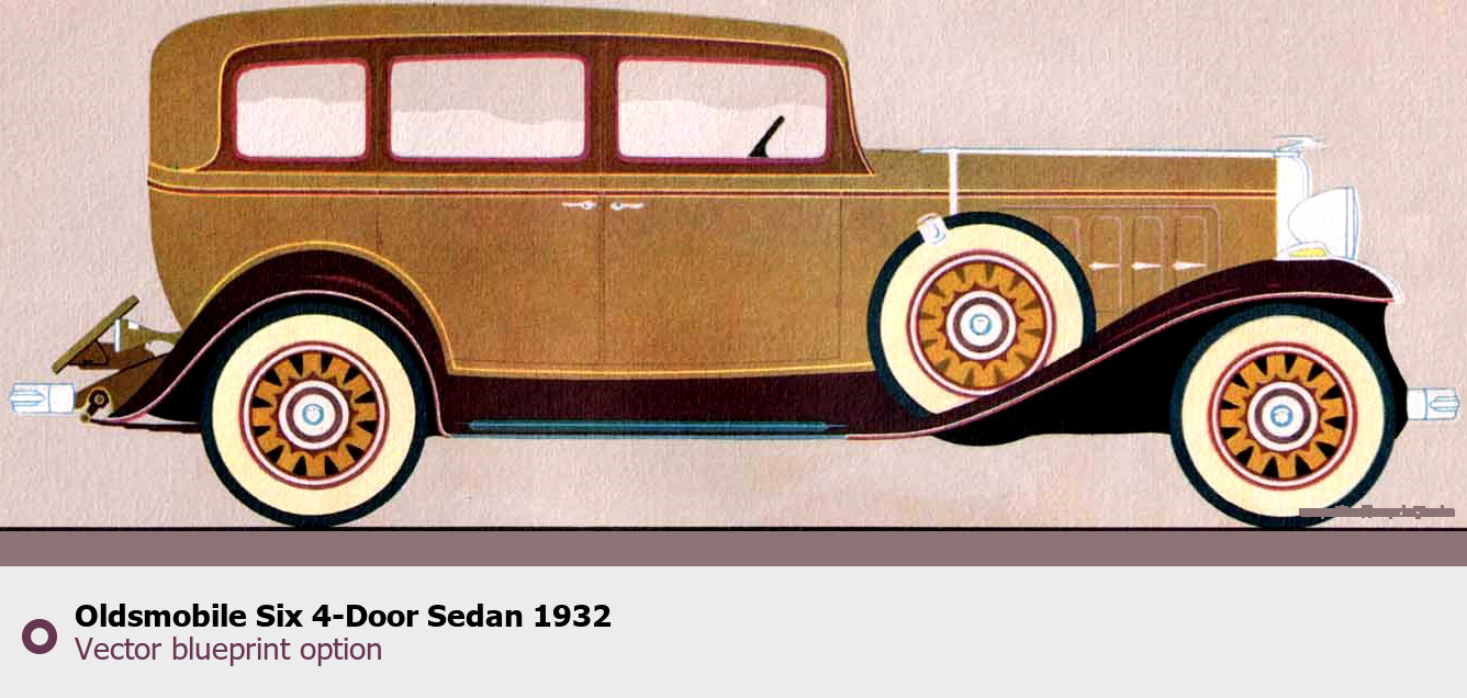 Raster blueprint of the 1932 Oldsmobile Six 4-Door Sedan Sedan. This free downloadable image can be used for graphic projects, digital design, and 3D modeling. The file provides accurate exterior proportions of the vehicle. Model year: 1932. Body type: Sedan.