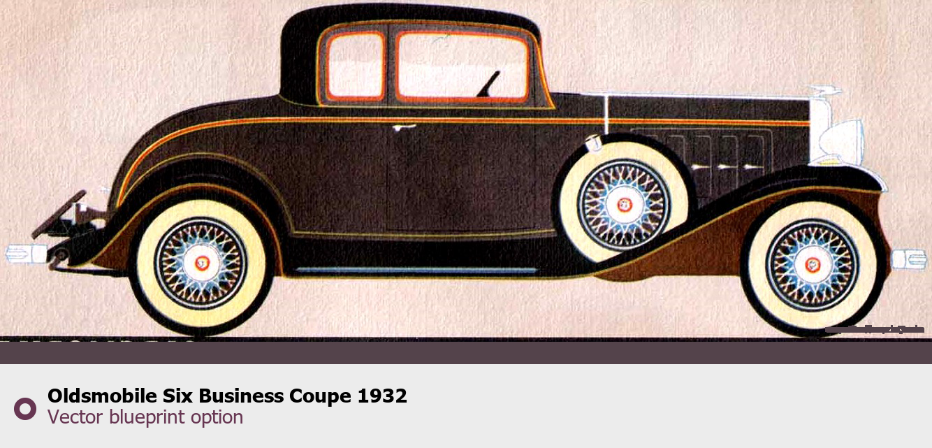 Raster blueprint of the 1932 Oldsmobile Six Business Coupe Coupe. This free downloadable image can be used for graphic projects, digital design, and 3D modeling. The file provides accurate exterior proportions of the vehicle. Model year: 1932. Body type: Coupe.