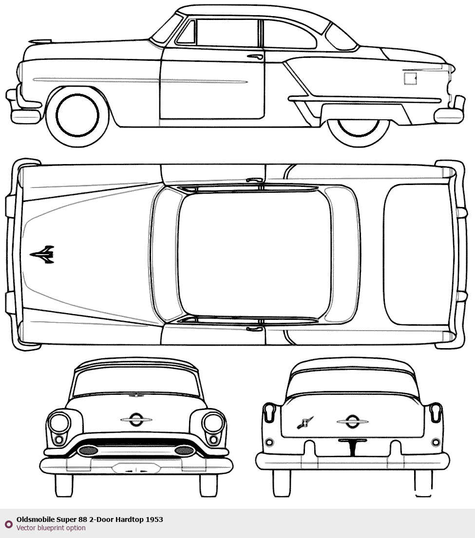 Raster blueprint of the 1953 Oldsmobile Super 88 2-Door Hardtop Tag. This free downloadable image can be used for graphic projects, digital design, and 3D modeling. The file provides accurate exterior proportions of the vehicle. Model year: 1953. Body type: Tag.