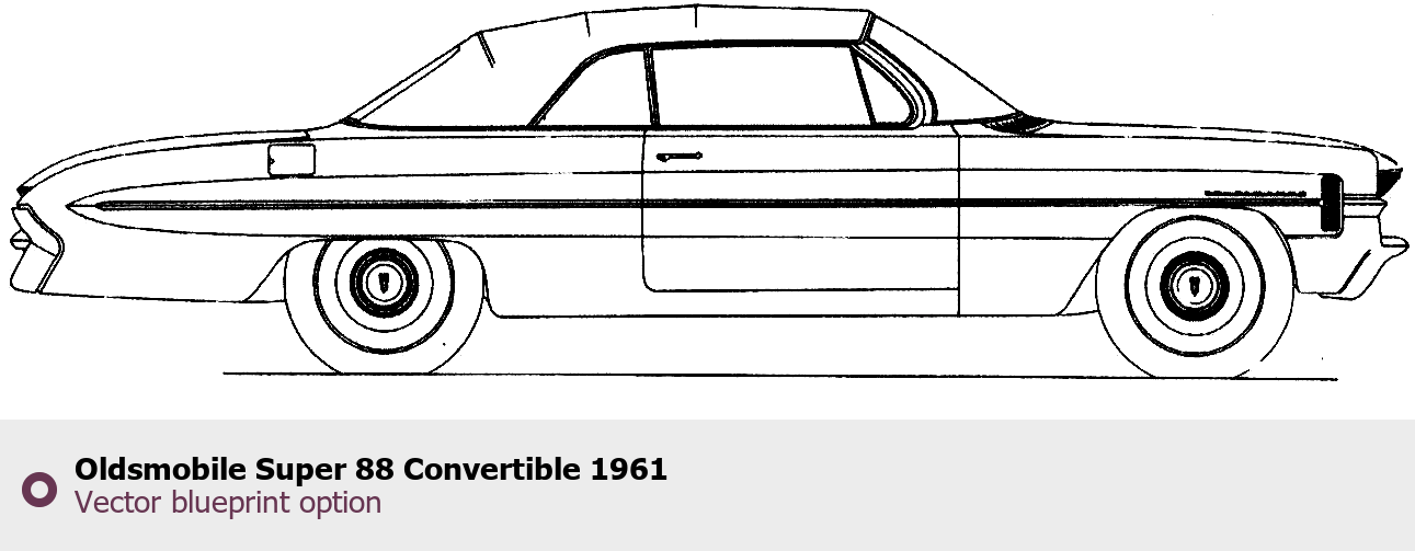 Raster blueprint of the 1961 Oldsmobile Super 88 Convertible Cabriolet. This free downloadable image can be used for graphic projects, digital design, and 3D modeling. The file provides accurate exterior proportions of the vehicle. Model year: 1961. Body type: Cabriolet.