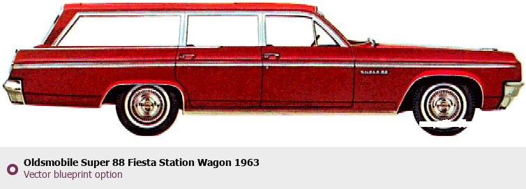 Raster blueprint of the 1963 Oldsmobile Super 88 Fiesta Station Wagon Wagon. This free downloadable image can be used for graphic projects, digital design, and 3D modeling. The file provides accurate exterior proportions of the vehicle. Model year: 1963. Body type: Wagon.