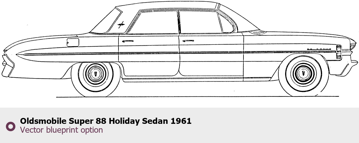 Raster blueprint of the 1961 Oldsmobile Super 88 Holiday Sedan Sedan. This free downloadable image can be used for graphic projects, digital design, and 3D modeling. The file provides accurate exterior proportions of the vehicle. Model year: 1961. Body type: Sedan.