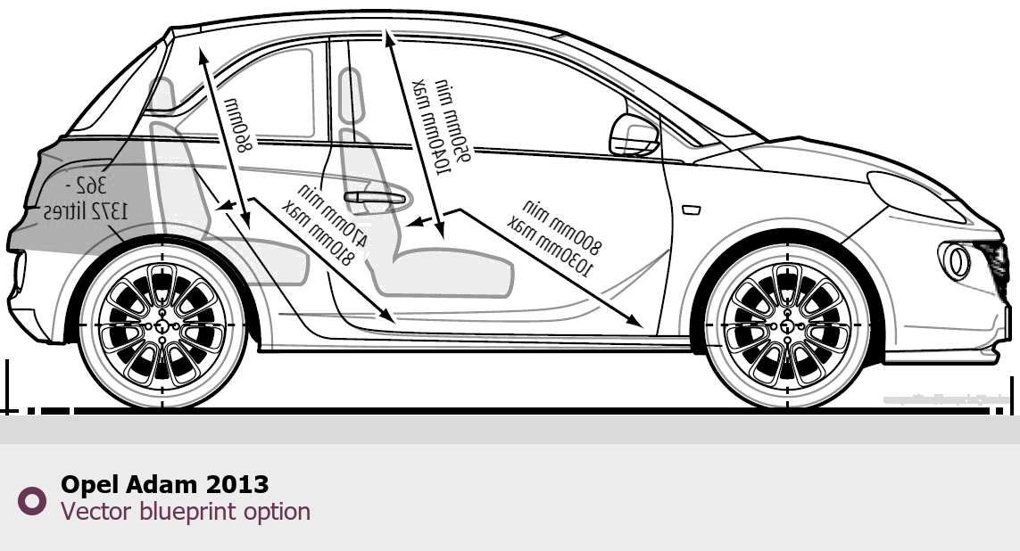 Raster blueprint of the 2013 Opel Adam Hatchback. This free downloadable image can be used for graphic projects, digital design, and 3D modeling. The file provides accurate exterior proportions of the vehicle. Model year: 2013. Body type: Hatchback.