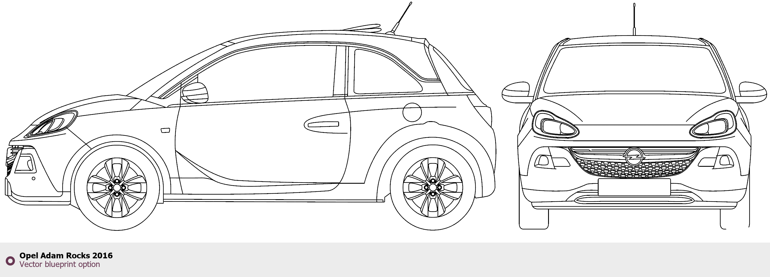Raster blueprint of the 2016 Opel Adam Rocks Hatchback. This free downloadable image can be used for graphic projects, digital design, and 3D modeling. The file provides accurate exterior proportions of the vehicle. Model year: 2016. Body type: Hatchback.