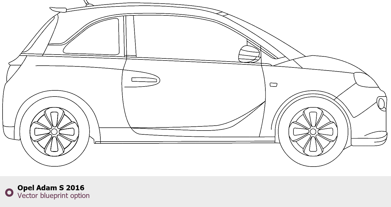 Raster blueprint of the 2016 Opel Adam S Hatchback. This free downloadable image can be used for graphic projects, digital design, and 3D modeling. The file provides accurate exterior proportions of the vehicle. Model year: 2016. Body type: Hatchback.