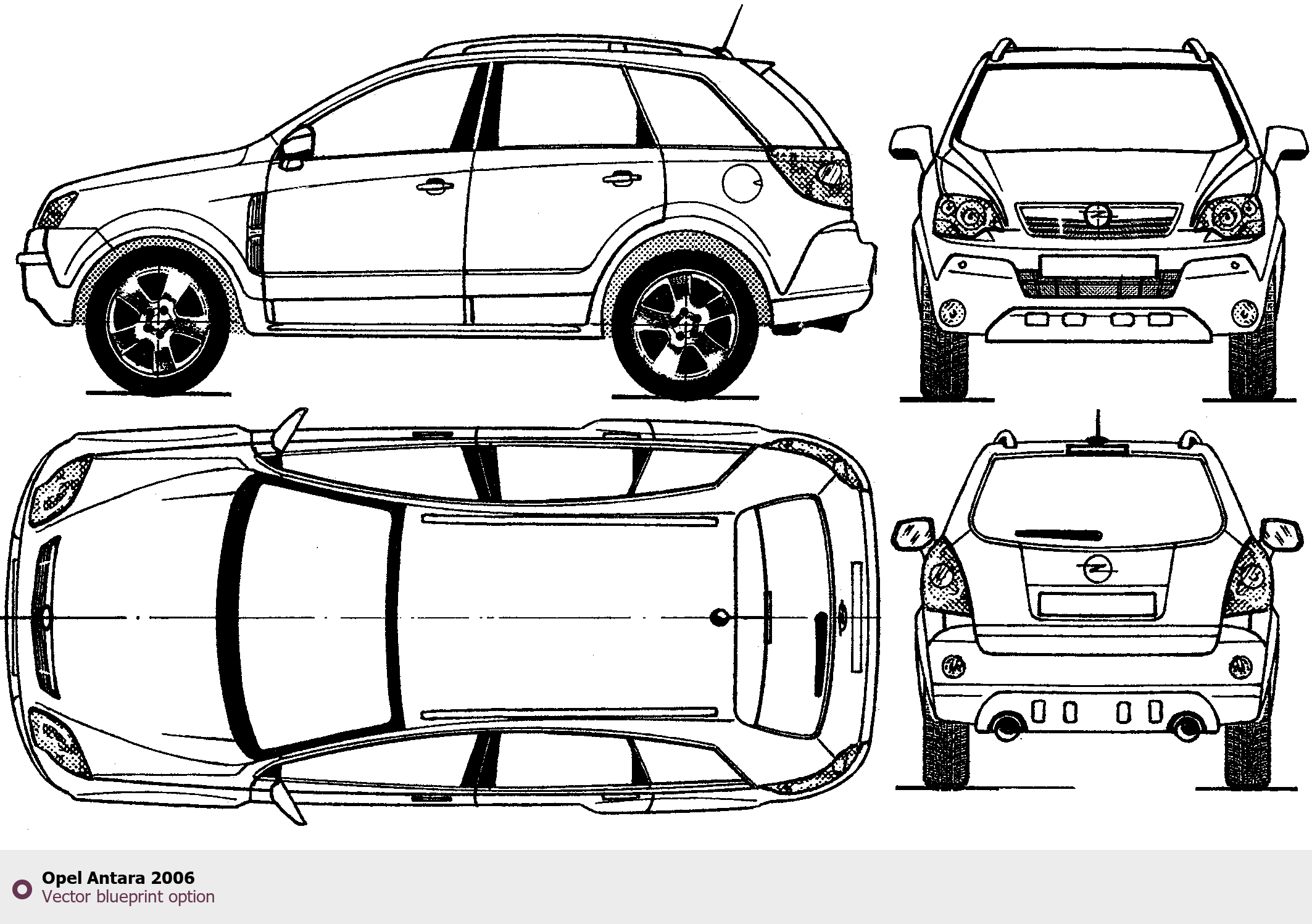 Raster blueprint of the 2006 Opel Antara SUV. This free downloadable image can be used for graphic projects, digital design, and 3D modeling. The file provides accurate exterior proportions of the vehicle. Model year: 2006. Body type: SUV.
