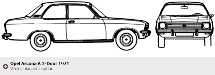 Raster blueprint of the 1971 Opel Ascona A 2-Door Sedan. This free downloadable image can be used for graphic projects, digital design, and 3D modeling. The file provides accurate exterior proportions of the vehicle. Model year: 1971. Body type: Sedan.