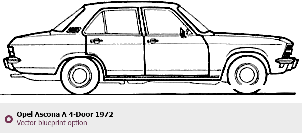 Raster blueprint of the 1972 Opel Ascona A 4-Door Sedan. This free downloadable image can be used for graphic projects, digital design, and 3D modeling. The file provides accurate exterior proportions of the vehicle. Model year: 1972. Body type: Sedan.