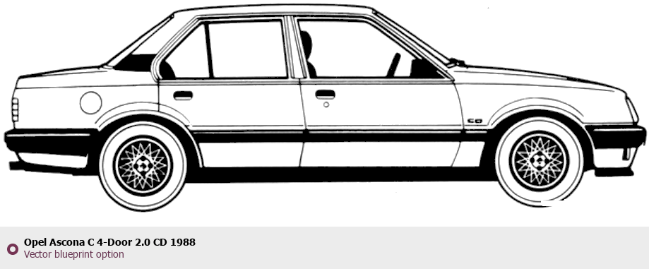 Raster blueprint of the 1988 Opel Ascona C 4-Door 2.0 CD Sedan. This free downloadable image can be used for graphic projects, digital design, and 3D modeling. The file provides accurate exterior proportions of the vehicle. Model year: 1988. Body type: Sedan.