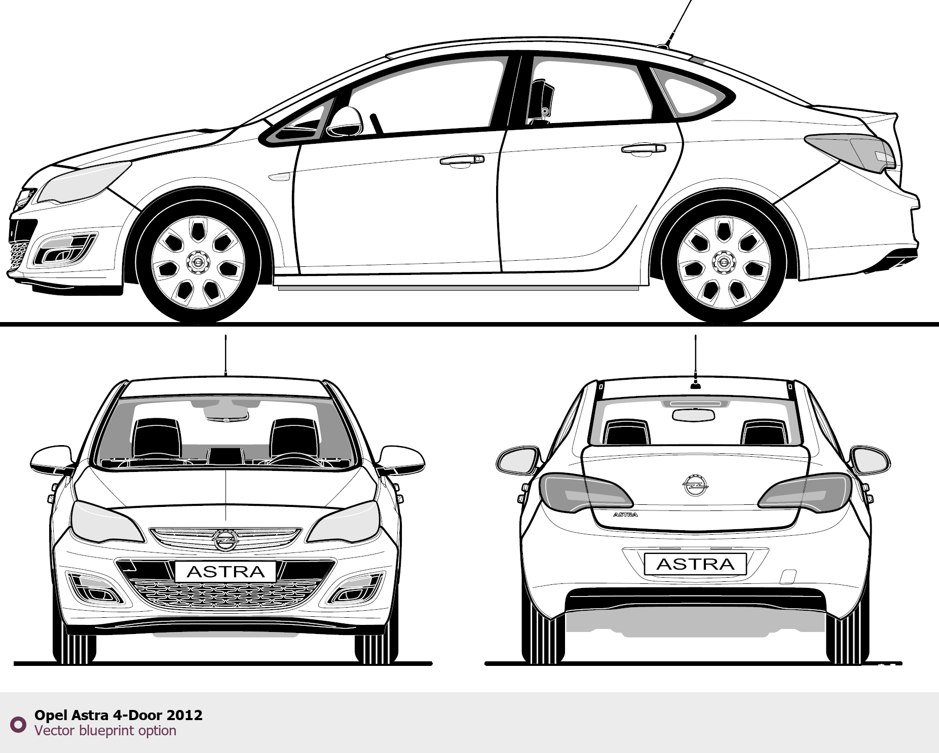 Raster blueprint of the 2012 Opel Astra 4-Door Tag. This free downloadable image can be used for graphic projects, digital design, and 3D modeling. The file provides accurate exterior proportions of the vehicle. Model year: 2012. Body type: Tag.