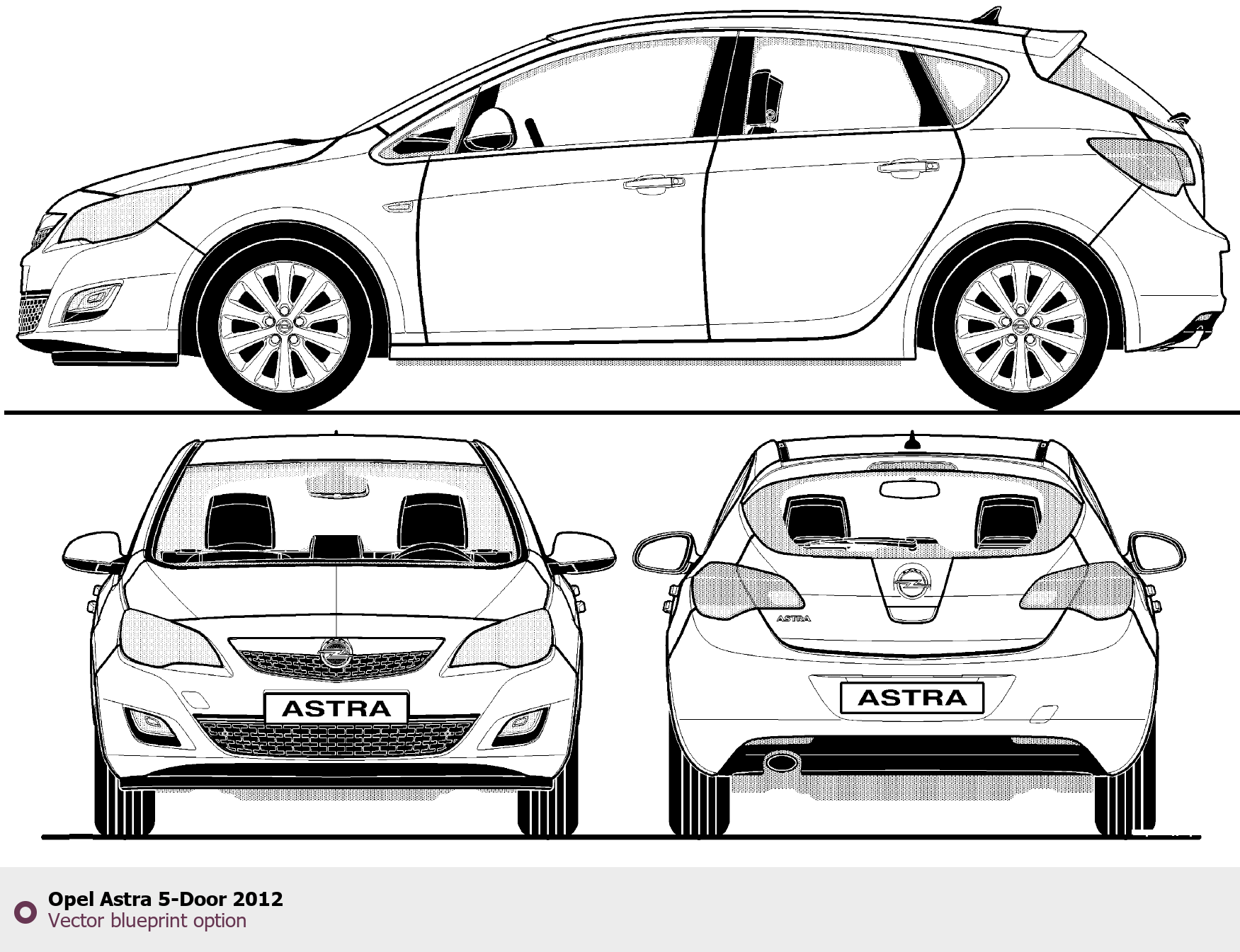 Raster blueprint of the 2012 Opel Astra 5-Door Tag. This free downloadable image can be used for graphic projects, digital design, and 3D modeling. The file provides accurate exterior proportions of the vehicle. Model year: 2012. Body type: Tag.