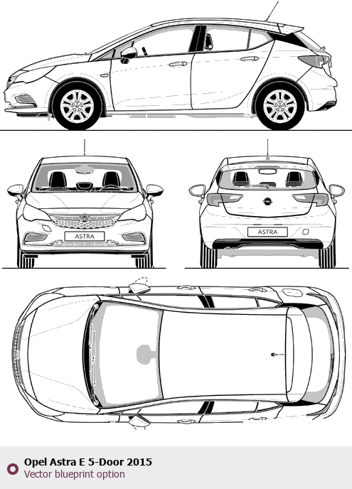 Raster blueprint of the 2015 Opel Astra E 5-Door Tag. This free downloadable image can be used for graphic projects, digital design, and 3D modeling. The file provides accurate exterior proportions of the vehicle. Model year: 2015. Body type: Tag.