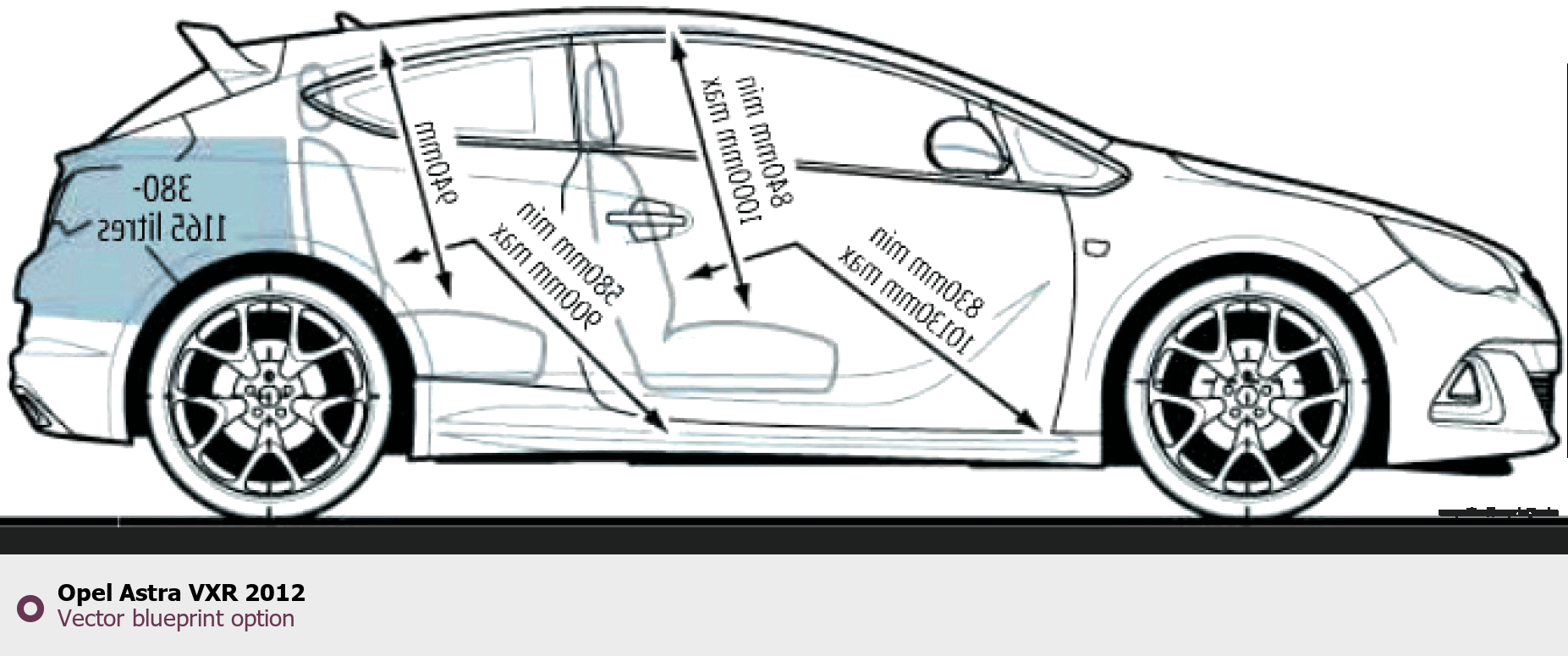 Raster blueprint of the 2012 Opel Astra VXR Tag. This free downloadable image can be used for graphic projects, digital design, and 3D modeling. The file provides accurate exterior proportions of the vehicle. Model year: 2012. Body type: Tag.