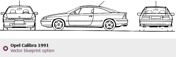Raster blueprint of the 1991 Opel Calibra Tag. This free downloadable image can be used for graphic projects, digital design, and 3D modeling. The file provides accurate exterior proportions of the vehicle. Model year: 1991. Body type: Tag.