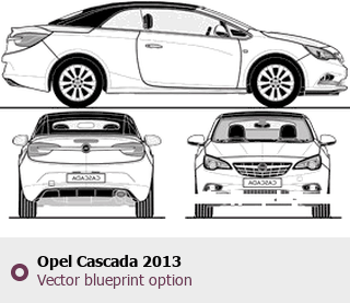 Raster blueprint of the 2013 Opel Cascada Cabriolet. This free downloadable image can be used for graphic projects, digital design, and 3D modeling. The file provides accurate exterior proportions of the vehicle. Model year: 2013. Body type: Cabriolet.
