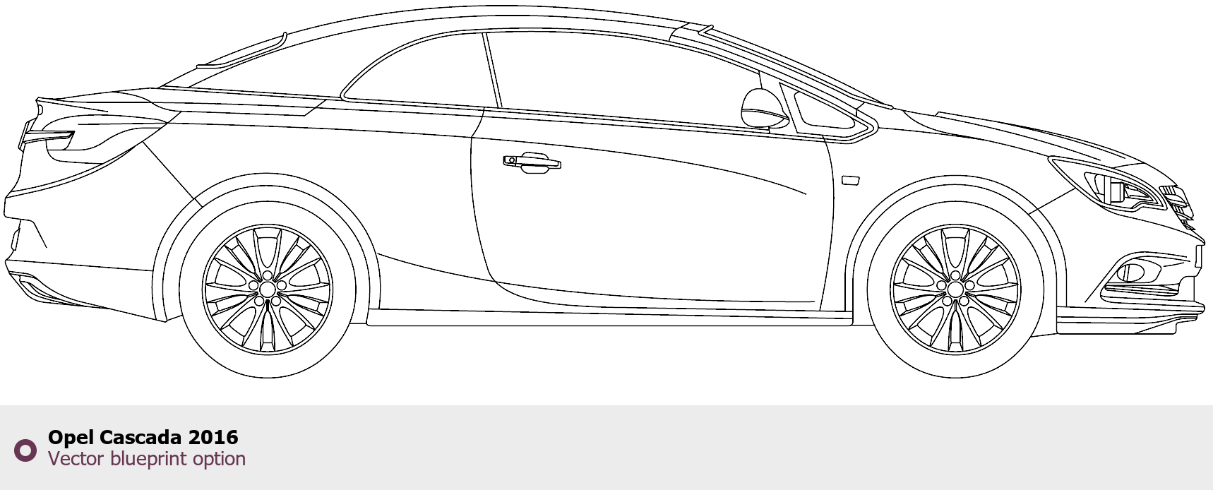 Raster blueprint of the 2016 Opel Cascada Cabriolet. This free downloadable image can be used for graphic projects, digital design, and 3D modeling. The file provides accurate exterior proportions of the vehicle. Model year: 2016. Body type: Cabriolet.