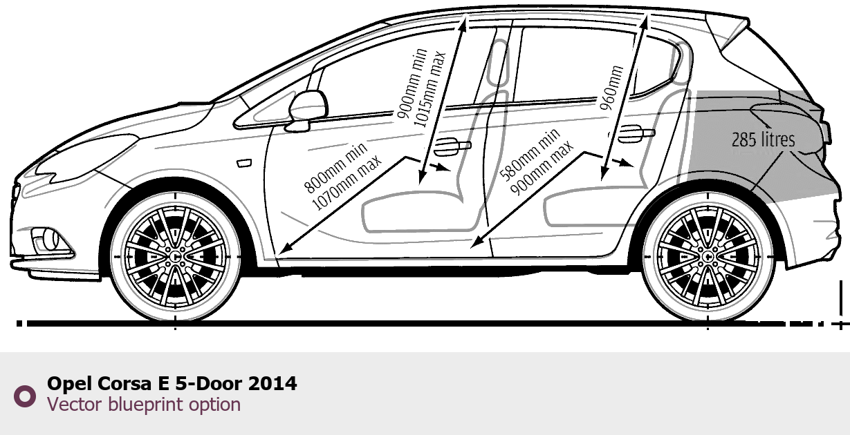 Raster blueprint of the 2014 Opel Corsa E 5-Door Hatchback. This free downloadable image can be used for graphic projects, digital design, and 3D modeling. The file provides accurate exterior proportions of the vehicle. Model year: 2014. Body type: Hatchback.