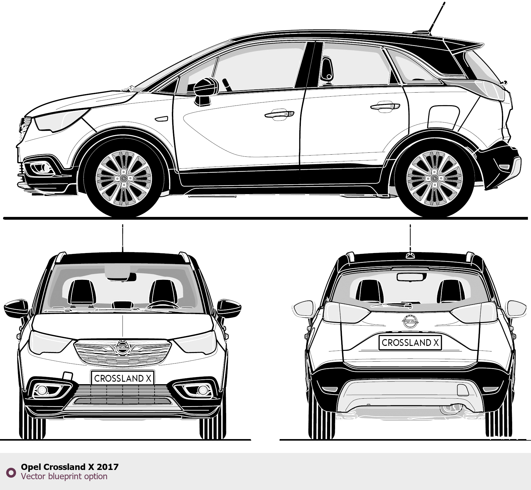 Raster blueprint of the 2017 Opel Crossland X SUV. This free downloadable image can be used for graphic projects, digital design, and 3D modeling. The file provides accurate exterior proportions of the vehicle. Model year: 2017. Body type: SUV.